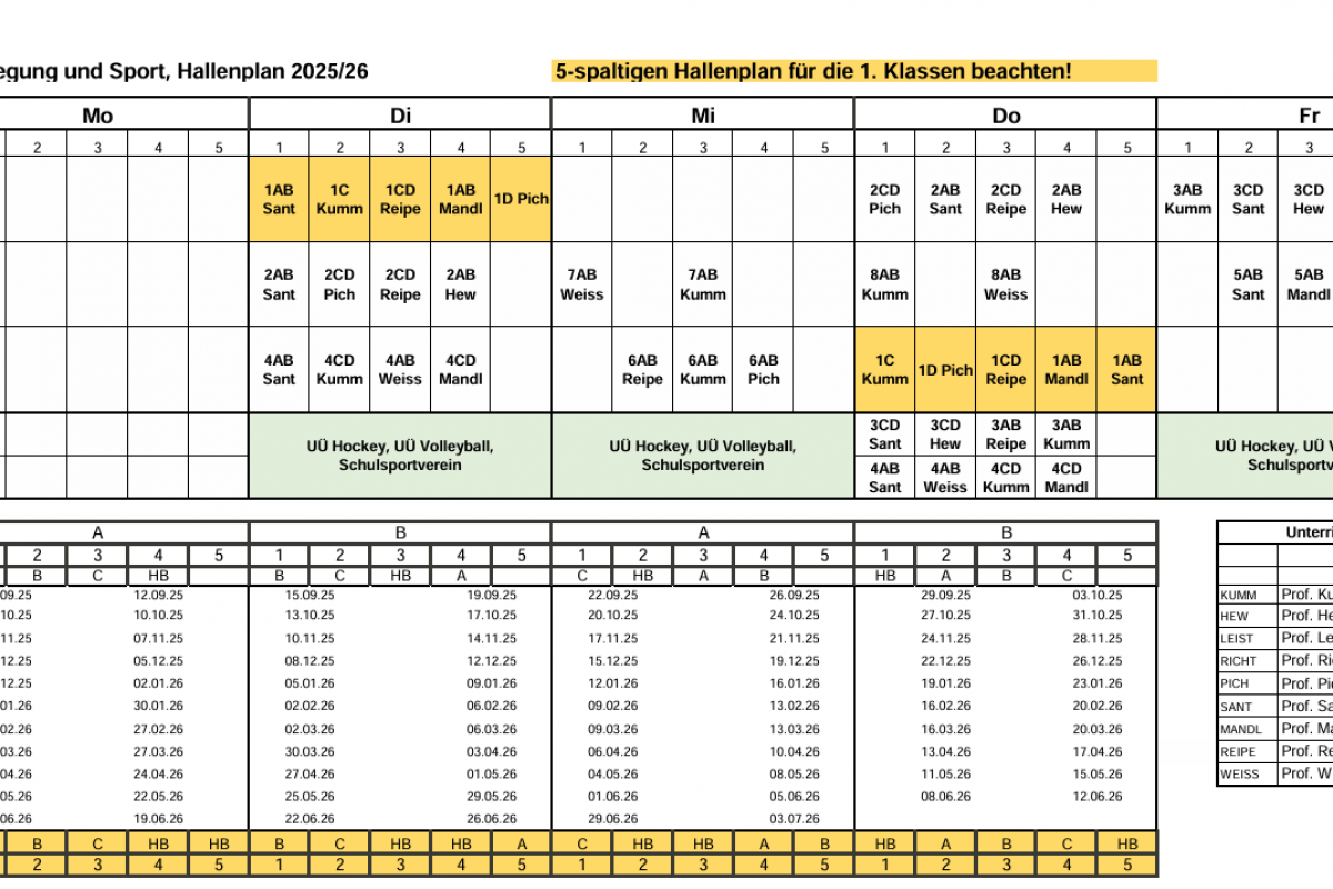 Die ersten Klassen orientieren sich am 5-spaltigen Raster (gelb hinterlegt), allen anderen Klassen am 4-spaltigen Raster!